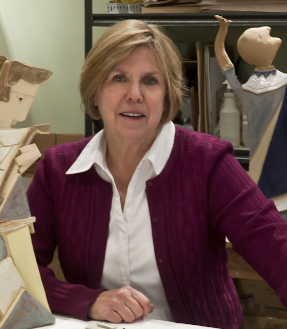 The handbuilt clay figures are constructed in parts, and in series, often with several heads or feet constructed and combined after firing. Little niches and drawers may reveal beads or buttons, artist books or feathers, odd hairdos or apples or birds, many birds. A figure may join another family, hats might appear and disappear; surprises are always embraced.