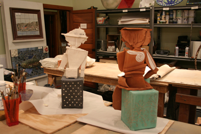 Balancing on the tables in the studio, perched on boxes, funny blue chairs and decorated pedestals, several new sculpture are coming to life in the studio for the month of July Featured Artist show and the August Invitational Sculpture Exhibit.