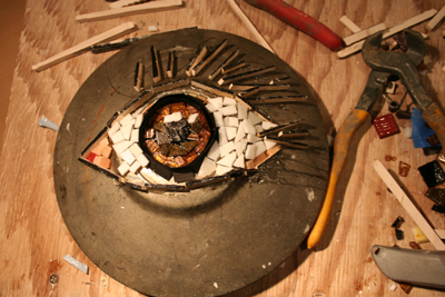 The Landfill Art Project provides hubcaps from the landfill for artists to use as a metal canvass. Here is my hubcap in progress…