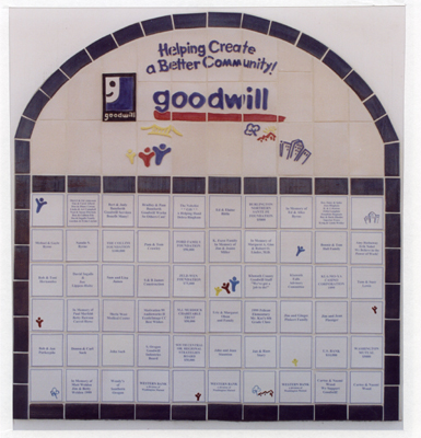 The Donor Recognition Wall consists of a 30 square foot panel of ceramic tiles with names printed on them. These 60 tiles, measuring 6” x 6”, contain up to eight names of Goodwill supporters. The Goodwill logo was replicated in brightly glazed ceramic tiles and incorporated into the overall design of the wall. It stands as a constant symbol of the community’s commitment and to the mission of Goodwill Industries; “Helping to Create a Better Community!”