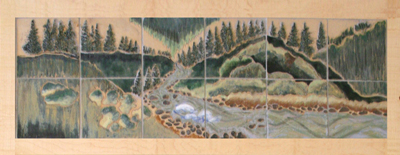 As part of the remodeling of the Community Health Center Clinic in Medford, Oregon, a donor recognition wall was designed with a ceramic landscape depicting the mountains and rivers of southern Oregon.