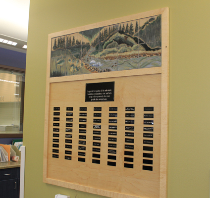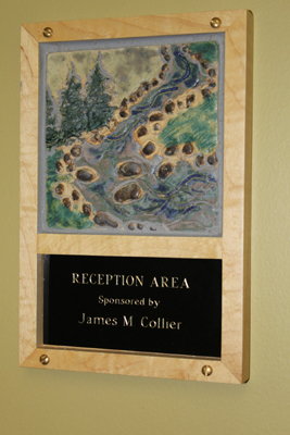 In order the recognize the strong support of the community, Susan Springer was contacted to help design a donor Recognition Panel and individual room tiles to honor specific donors and celebrate the beautiful natural beauty of our Southern Oregon home.