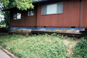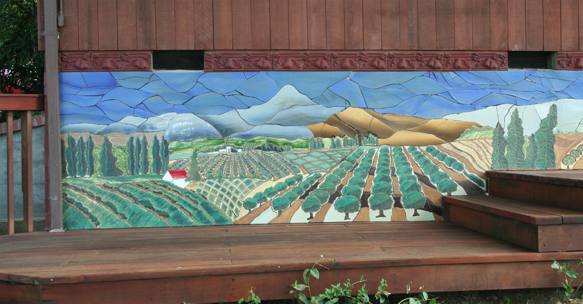 “The Pear Orchard” was created and installed by Susan Springer and Illahe Tileworks for a private homeowner in Oregon’s richRogueValley. Designed for a pear orchard owner and collector of fruit crate labels, the mural was designed with an eye to the colorful stylized labels. The brightly glazed ceramic tile mosaic depicts the historic view from the property with Roxy Ann, the mountain landmark on the horizon. Measuring 40 feet in length, it is installed directly onto the exterior of the home. This is one of many successful site-specific art projects created by Illahe Tileworks.