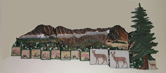 Eastern Oregon University in La Grande, is home to this large-scale landscape mural, custom made by Susan Springer and Illahe Tileworks. Funding for this and other “public art” projects comes fromOregon’s 1% for Art Program, whereby all new public buildings must allow 1% of their total budget for creation of juried art, to be installed for public perusal.