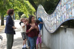 In the summer of 2008, Ashland’s Peace Fence was destroyed by vandals. The community grieved its loss, even as we pondered ways to resurrect the Peace Fence in a sturdier and less vulnerable form. The idea of a Peace Wall, comprised of tiles of the Peace Fence panels, was proposed. In March, 2009, the Ashland City Council unanimously approved the Ashland Public Library as the site for this new Peace Wall. Because we have excellent photos of every Peace Fence panel (over 200 of them), we created ceramic tiles replicating each one. The tiles were made using a dye sublimation process that results in tiles that are resistant to fading and weather. They were encased in a mosaic background and placed within a metal sculpture in front of the Library. A dedication celebration was held on International Peace Day, September 21, 2010.