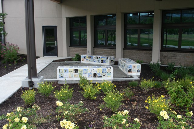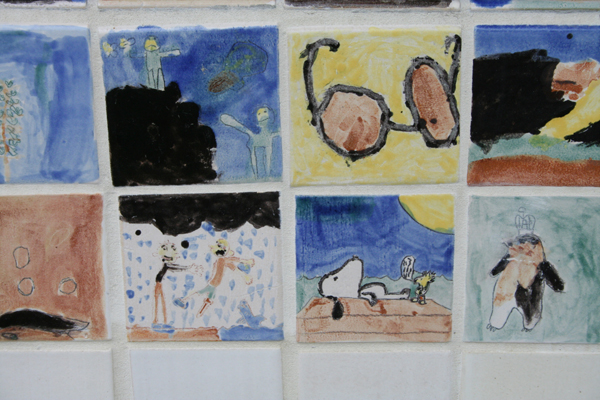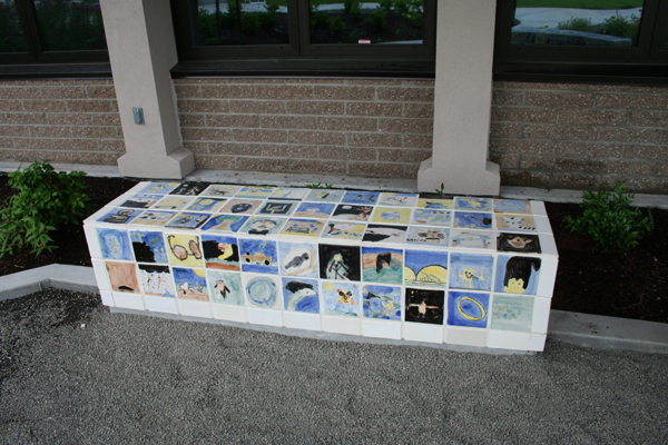 As part of an “Artist in the Schools” program at Helman Elementary School, Susan Springer visited classroom from Kindergarten to 4th grade, leading a discussion about books and “favorite books”. The designs were developed on paper and later drawn and painted with colorful glazes on 6″ x 6″ tiles These tiles were fired, returned to the classroom for evaluation and discussion before being permanently installed on three benches just outside the schools new library, creating a favorite book reading area.