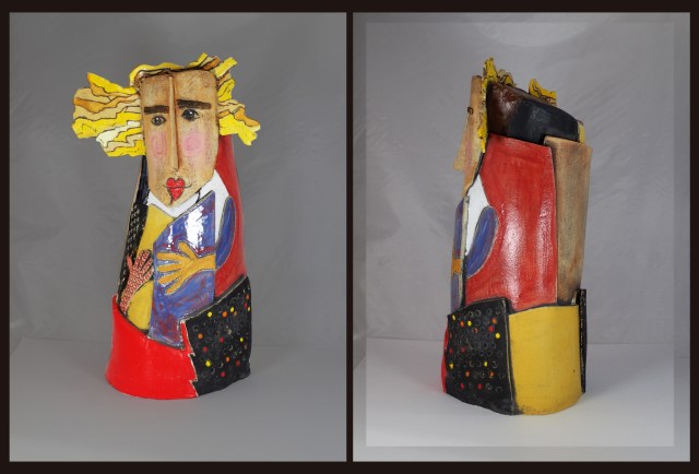 “Girl with Mandolin; One Hundred Years” is inspired by Pablo Picasso’s painting which was painted in 1910. This ceramic sculpture, in matte textures, measures 20″ h. x 10″ w. x 8″ d. Handbuilt from stoneware clay slabs, this piece plays with the cubist concept of intersecting plane, line and field.