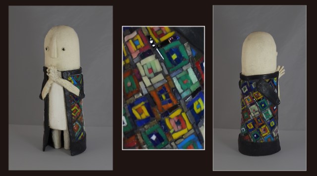 The “Mosaic Monk” features glass mosaic on his robe, in the style of Moroccan tile or rug patterns. Inspired by an artist trip to Morocco in 2018, this simple figure sparkles with colorful glass.