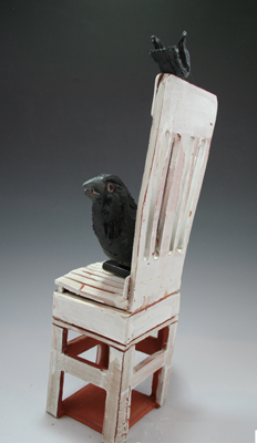 A black raven perched on a whitewashed chair creates the ceramic sculpture “Raven Seated”. Measuring 19′ h x 10″ w x 6″ d. the two part sculpture combines memory and dream in a whimsical work of art. $800 SOLD